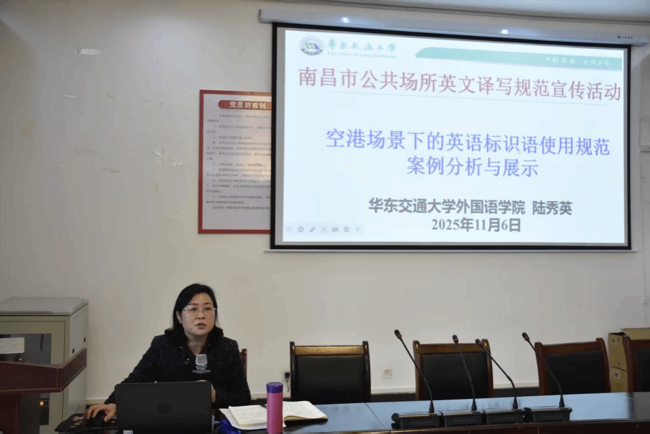 讲座聚焦“空港”这一关键国际化场景。陆秀英教授先分析了空港英语标识语的特点及准确性、规范性、国际性和功能性译写原则,并结合南昌市空港英文标识的实地检查情况,通过大量图片资料,剖析了部分标识语存在的语言、语意以及语用等方面的问题,分享了专家团队审核修订意见。